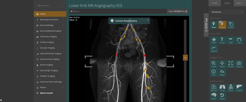The VoxelX platform is filled with many tools that allow medical students and radiologists to interact easily with DICOM-Images. Among these tools are innovative drawing tools that make it possible to connect and connect the structure and illness of the image with all recognized knowledge resources on the web.